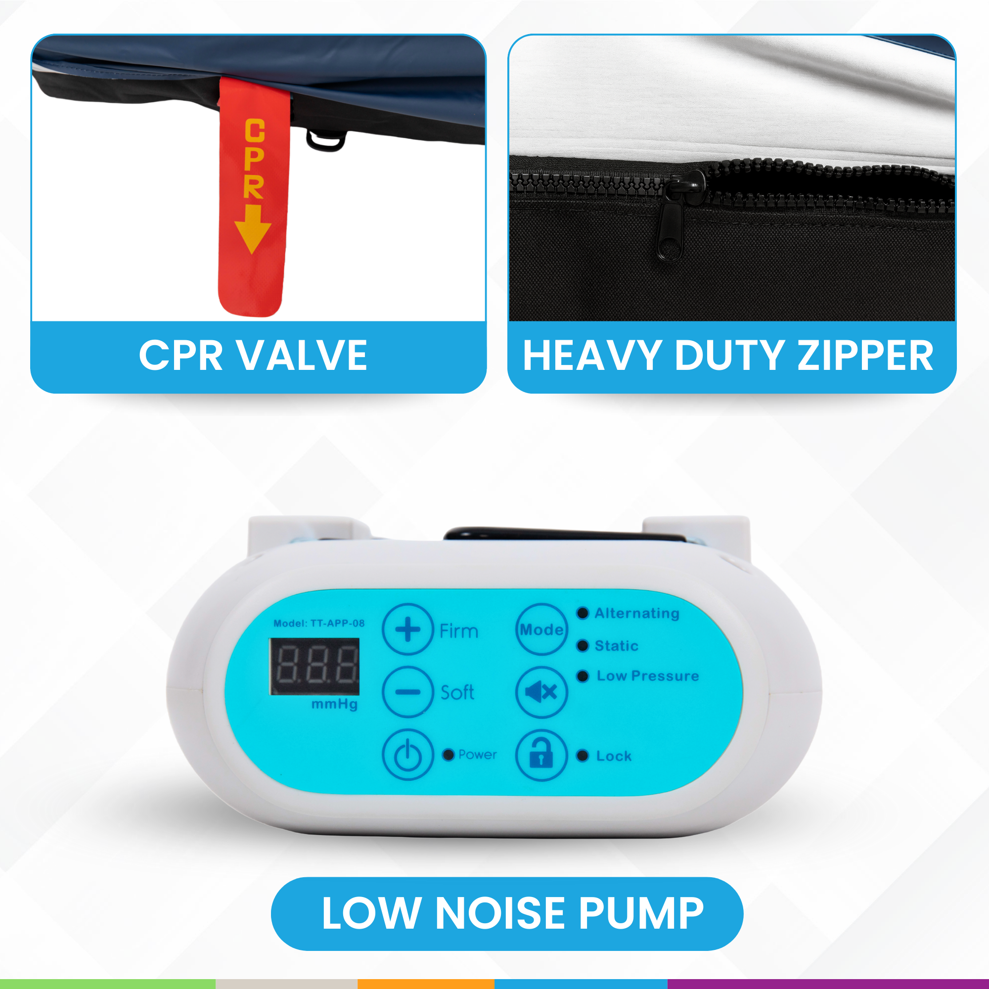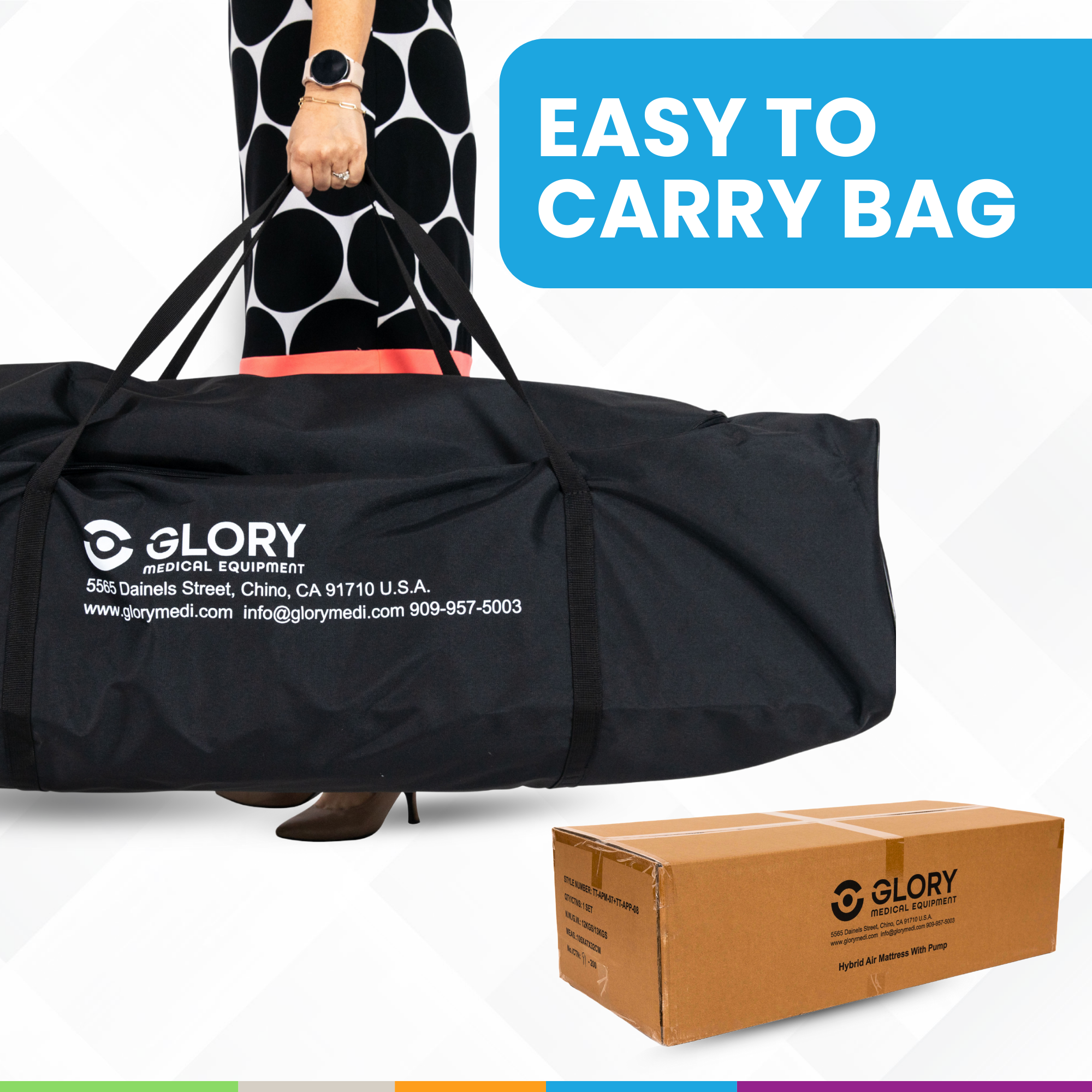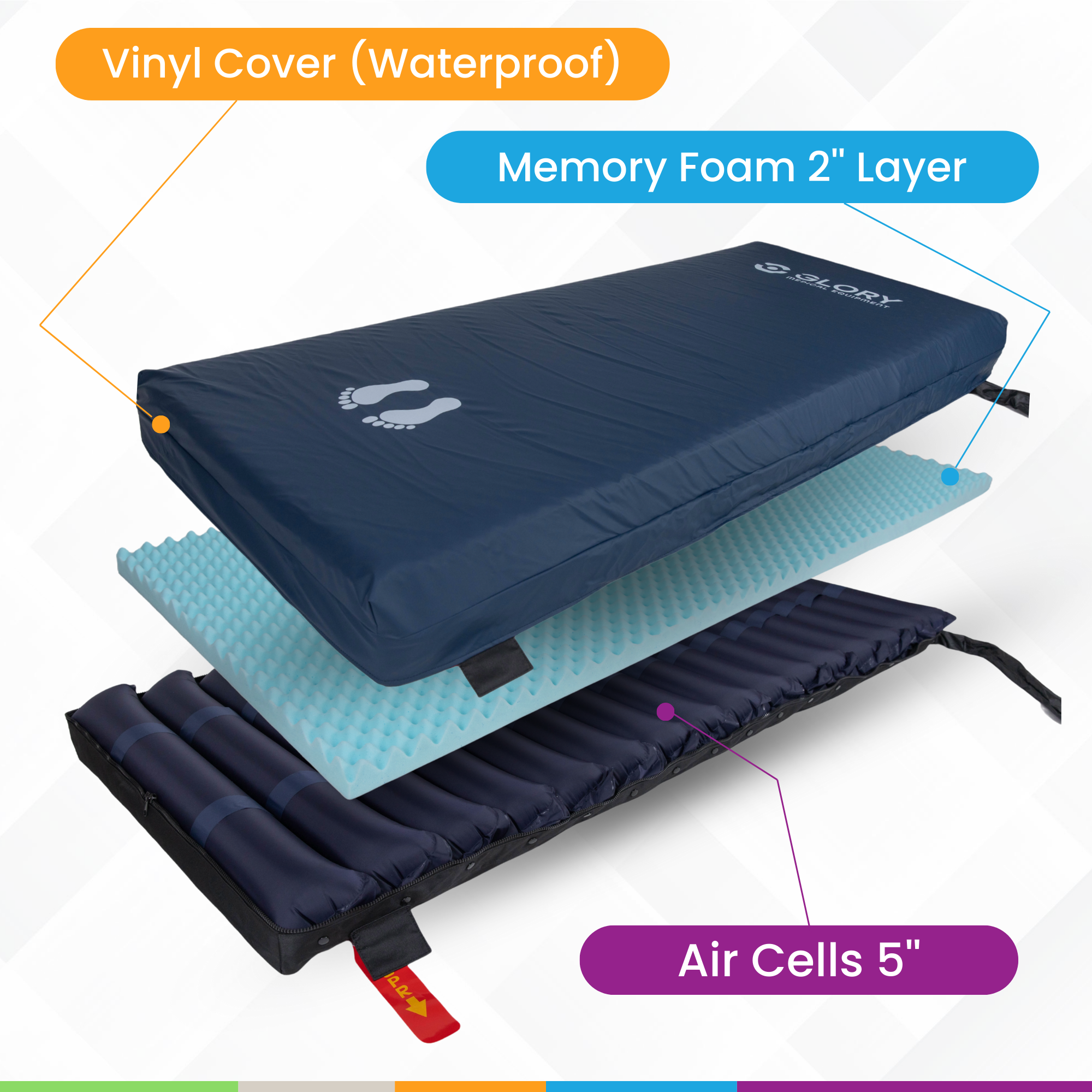 Glory Medical (MA-7H) Low Air Loss Alternating Pressure Mattress– Waterproof Vinyl Cover, 2” Memory Foam + 5” Air Cells, Low Noise Pump with Adjustable Pressure | CPR Valve, Carry Bag & Repair Kit