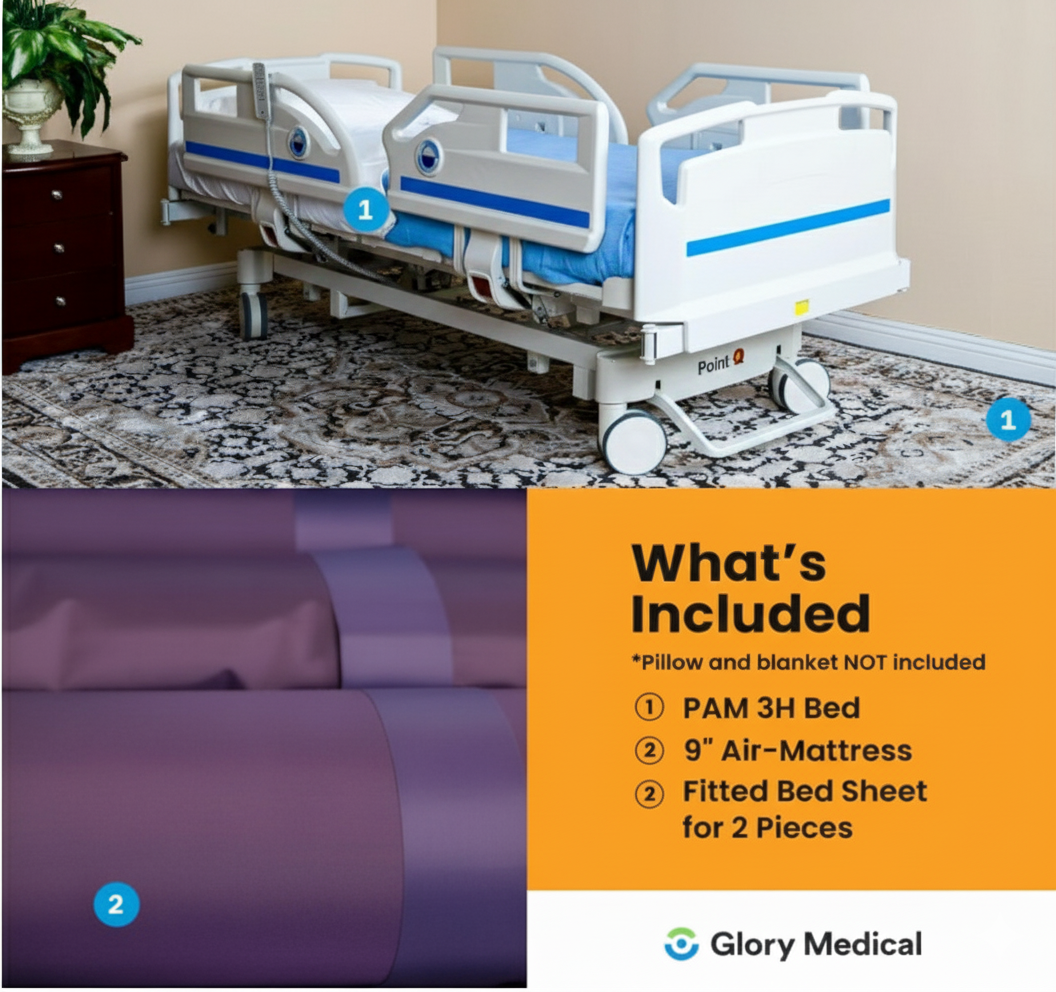 Point A (PAM-3H) Premium 3-Function Full Electric Hospital Bed for Home Use, 5.9" Memory Mattress Made in USA, LINAK Motor, Central Locking, 6" Casters, Includes (2X) Bed Sheet